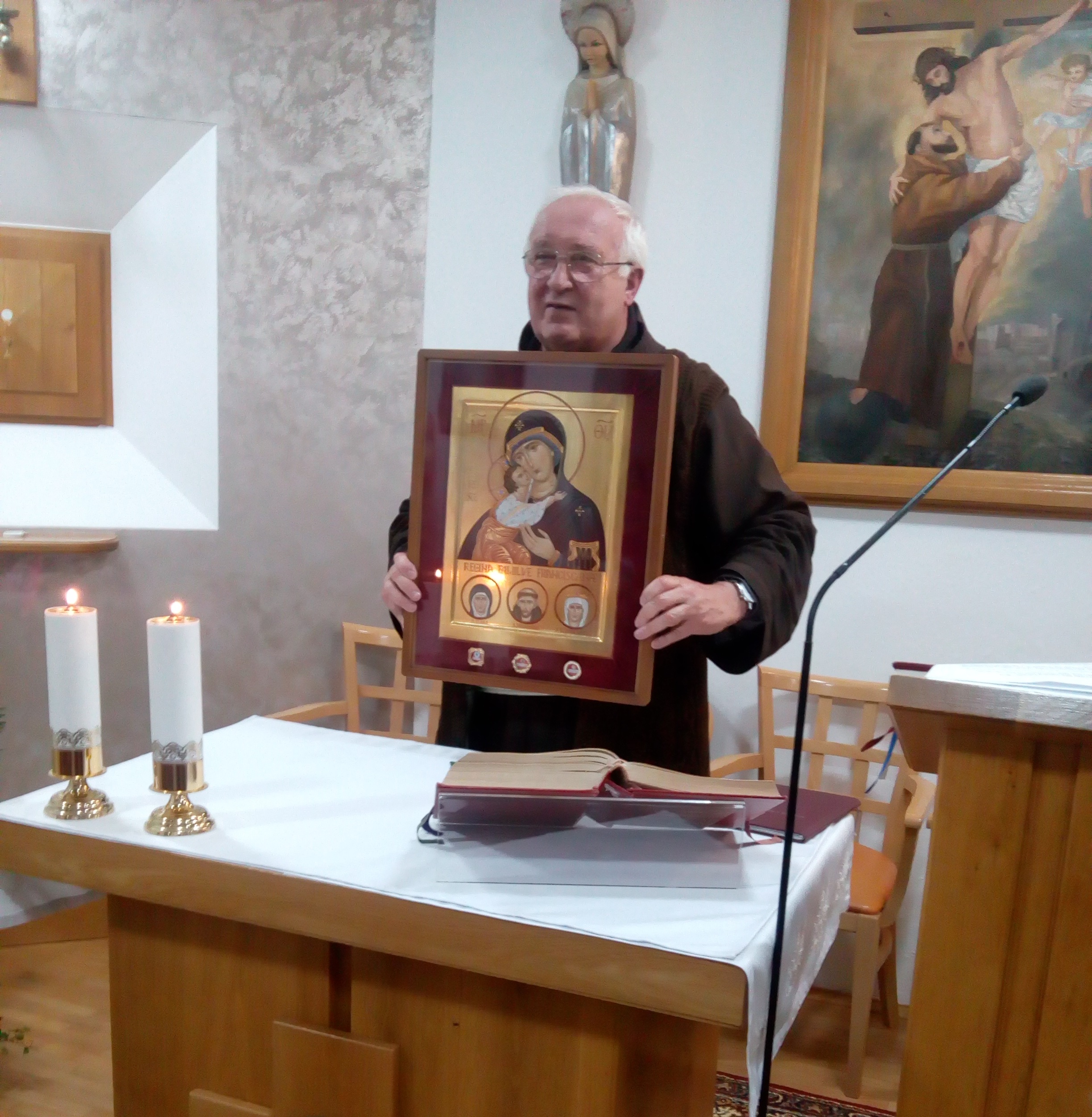 V našom dome sme ju privítali podvečer prvej stredy v mesiaci október v sprievode miestnych členov svetského rádu františkánov. V priestoroch našej kaplnky sa vytvorilo modlitbové spoločenstvo, uctili sme si ikonu, oboznámili sa so symbolmi na obraze, s relikviami troch svätcov s. Kláry, sv. Františka z Assisi a sv. Alžbety Durínskej. Spoločne sa modlili františkánsky ruženec, ktorý pozostáva zo siedmich desiatok ruženca, na počesť siedmich radostí Panny Márie. Do druhého dňa sme čerpali posilu a svetlo z prítomnosti ikony. Svätou omšou sme ju dôstojne vyprevadili na ďalšiu púť, ktorá sa koná po celej Európe.